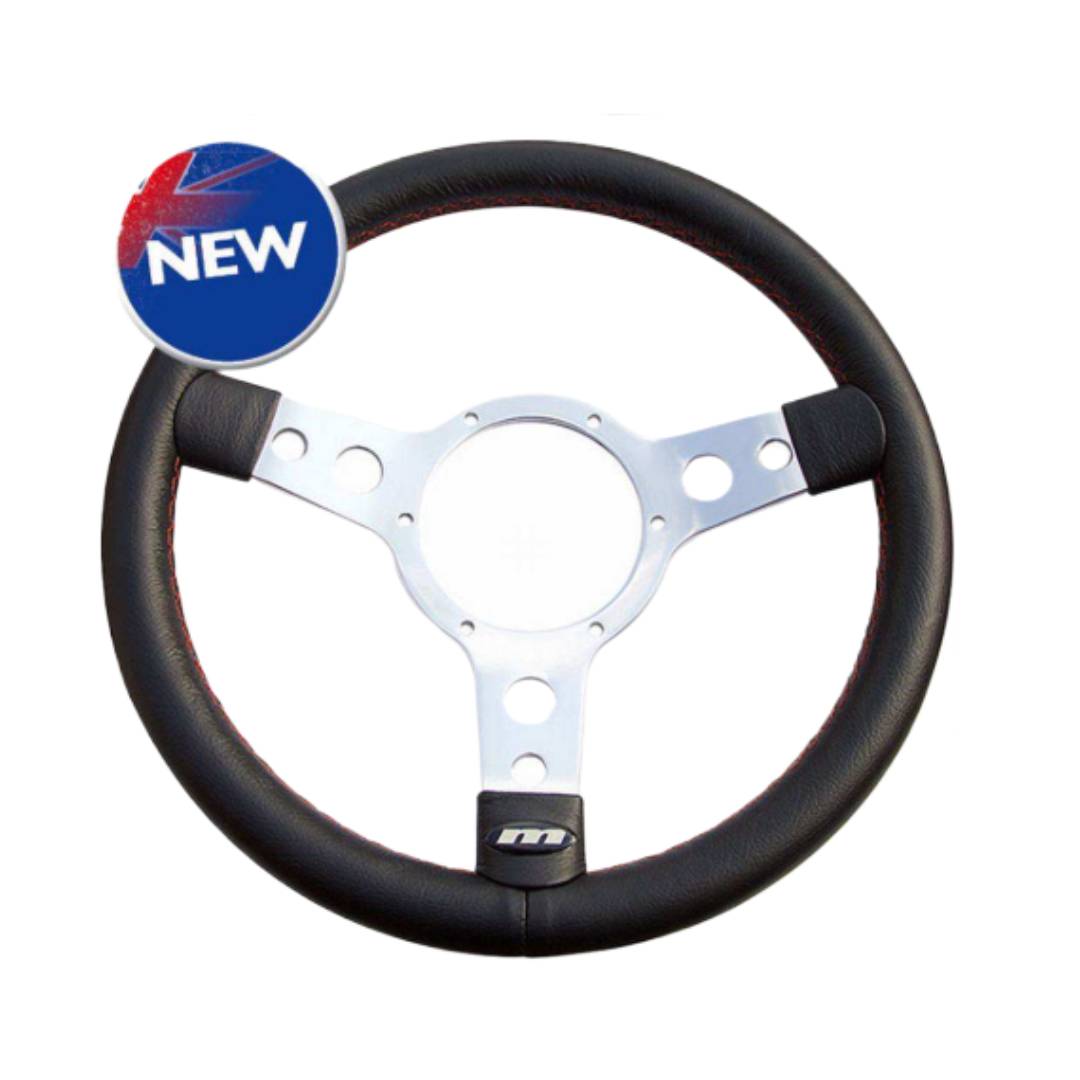 STEERING WHEEL 13" Leather Hide Red Stitching Semi Dish 3 spoke